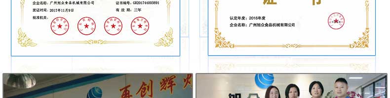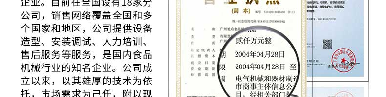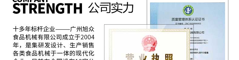 廣州旭眾食品機械有限公司是一家集科研開發(fā),生產設計,營銷服務為一體的現(xiàn)代化生產企業(yè)?,F(xiàn)代化生產車間,精湛制造技術,所產機械歷經市場重重考驗,不斷贏得海內外客戶的贊譽。